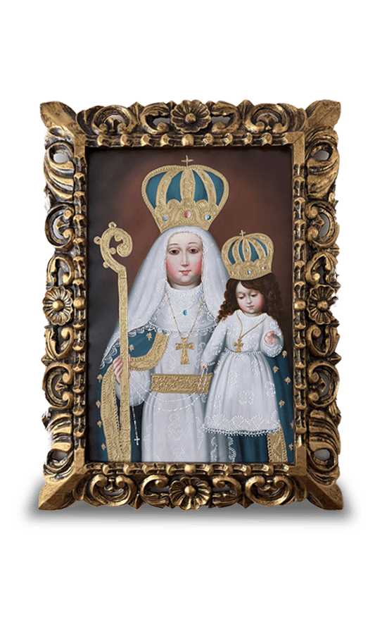 Perfecto para altares, capillas domésticas, espacios de oración o como pieza central en una colección devocional, este lienzo combina arte colonial, historia, fe y acabados premium en una sola obra.