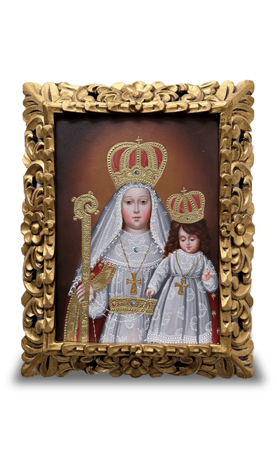 Hermoso lienzo pintado totalmente a mano al óleo por la tradicional Escuela de Arte Cusqueña, representando a Nuestra Señora del Buen Suceso de la Purificación con su imponente y majestuoso manto rojo, símbolo de amor, sacrificio y realeza espiritual. La Virgen sostiene al Niño Jesús en su brazo derecho, ambos portando coronas finamente ornamentadas con detalles rojos, elaboradas con técnica artesanal que resalta su nobleza y belleza celestial.